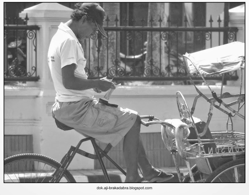Uang yang ada di kantong hitam beragam besarnya. Ada 1000 an, 5000 an, 10.000 an bahkan 20.000 an. Aku heran melihat uang sebesar itu untuk saweran. Bagi banyak orang uang 20 ribu bukanlah hal yang besar. Sekali makan di restoran siap saji hanya dapat sebuah burger. Namun bagi seorang tukang becak itu adalah jatah makan sehari. Banyaknya angkutan kota dan semakin banyak orang memiliki motor maka becak kurang lagi diminati, sehingga banyak tukang becak kesulitan untuk mencari pelanggan. Sudah sering aku dengar bahwa dari pagi sampai siang kalau dapat 10 ribu saja itu sudah beruntung. Tapi kini dia rela memberikan uang 20 ribu untuk temannya yang meninggal dunia.
